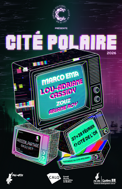 Après avoir repris vie sous la bannière de CITÉ POLAIRE en 2024, les soirées hivernales les plus effervescentes de Val-d’Or sont de retour pour danser ta relâche. Les 27 et 28 février, la Cité de l’Or s’illuminera au rythme de performances aussi fortes qu’inoubliables : Lou-Adriane Cassidy, Ariane Roy, zouz, Marco Ema ainsi que le duo passion_partage, formé des VJ et DJ, Zazouu et Mamiilou.