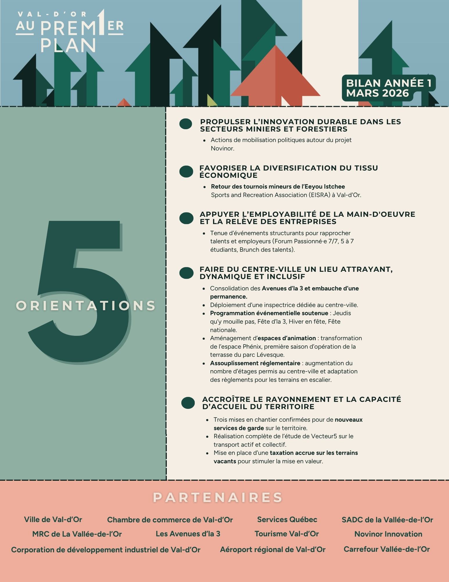 Intitulé Val-d'Or au premier plan, cette initiative conjointe de la Ville de Val-d'Or, la MRC de La-Vallée-de-l'Or, la Chambre de commerce de Val-d'Or, la Corporation de développement industriel de Val-d'Or, Les Avenues d'la 3, la SADC de la Vallée-de-l'Or et Services Québec vise à :